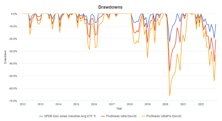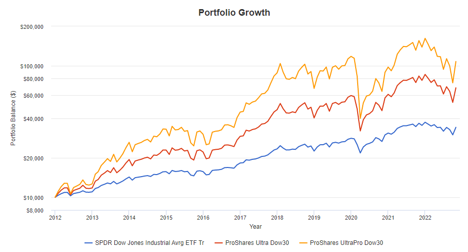 레버리지 정도에 차이가 있어서 확실히 3배 레버리지인 UDOW가 제일 좋은 성과를 보이고 있어요.
