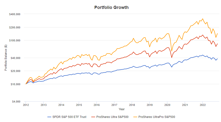 SSO는 SPY보다 2배 정도 되는 수익을 보여줬고, UPRO는 3배 이상의 수익을 보여줬어요.